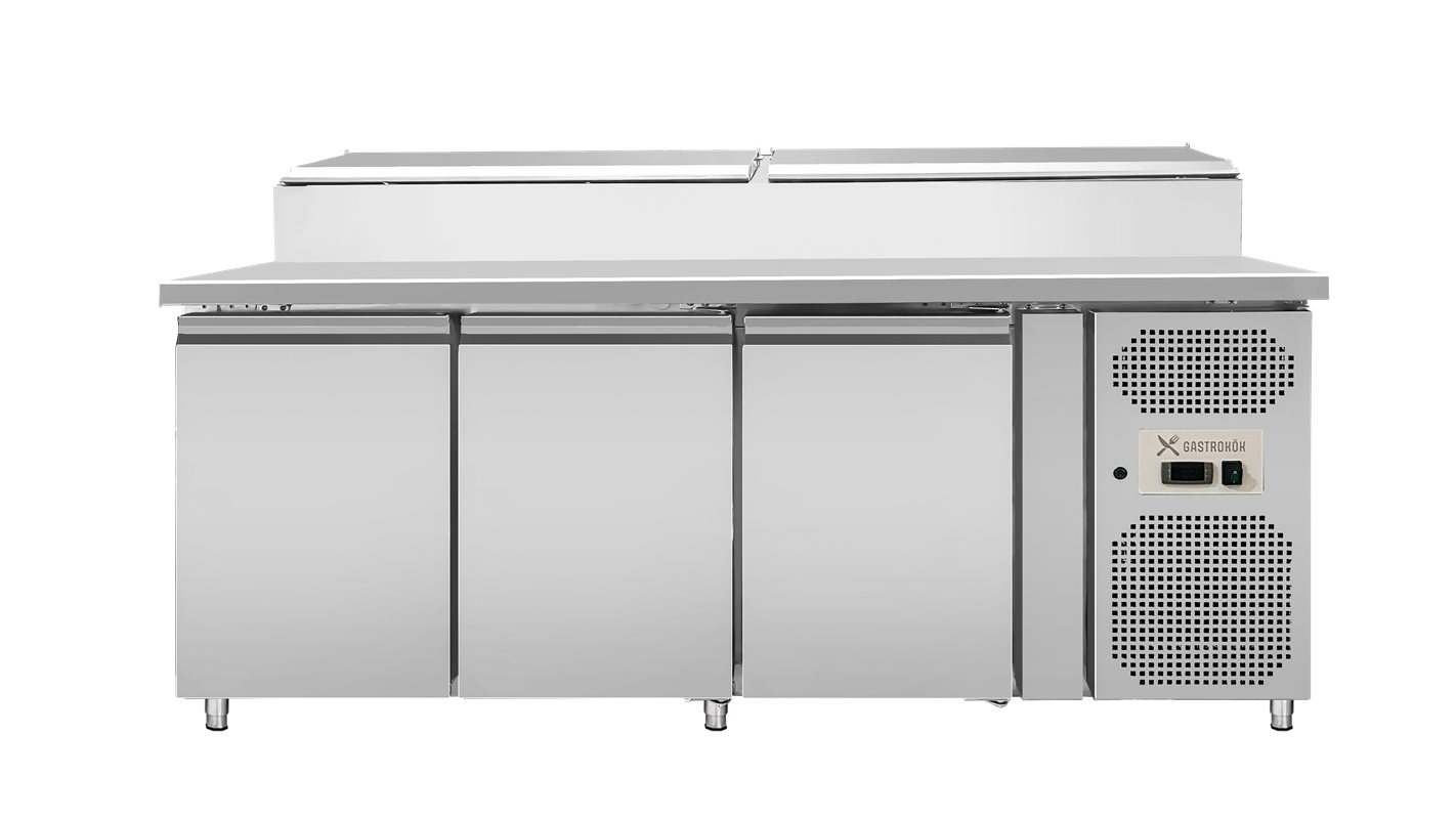Kylbänk 3 dörrar med kyld ränna Gastrokök. Rostfritt utförande. Gastronormanpassade lådor GN 1/1. Den kylda rännan är GN anpassad för GN 1/6-150mm kantiner. Justerbara fötter. (OBS! Hjul kan fås som tillägg Ej standard)